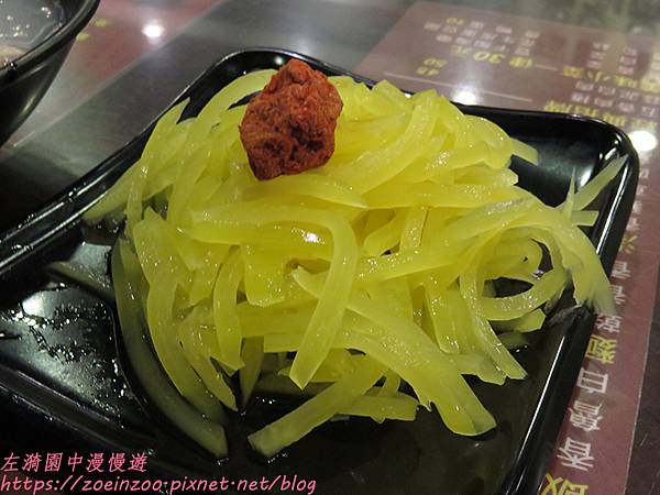 ↑百香木瓜絲,30元。菜單上標示的上市新品,醃浸得黃澄澄的木瓜絲上有一顆紅色乾話梅,跟木瓜絲攪拌過後應該會又多了些梅香,但我個人有點怕這種紅色話梅,總覺得它們都是色素>_<。其實不需要話梅加持,木瓜絲已經很有味道,爽脆中有酸甜百香果味。