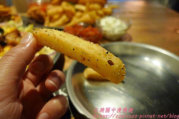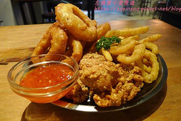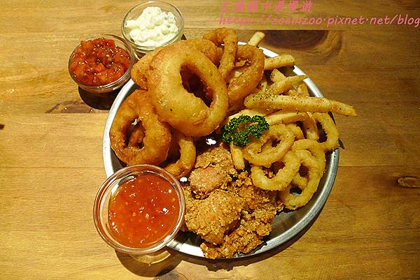 ↑炸物大拼盤(可選四種炸物),340元。份量足夠四個人食用,很適合晚上來喝啤酒小酌時,點來當下酒菜。我們選了:沾醬薯條、蘿勒炸雞、炸花枝圈、自製洋蔥圈。