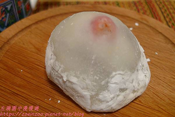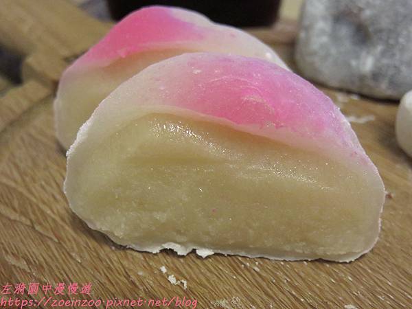 明月堂的草莓大福外觀都是像這樣,頂端透著一點粉紅,那其實就是草莓的尖端。整個看起有點像壽桃,覺得還蠻討喜的。