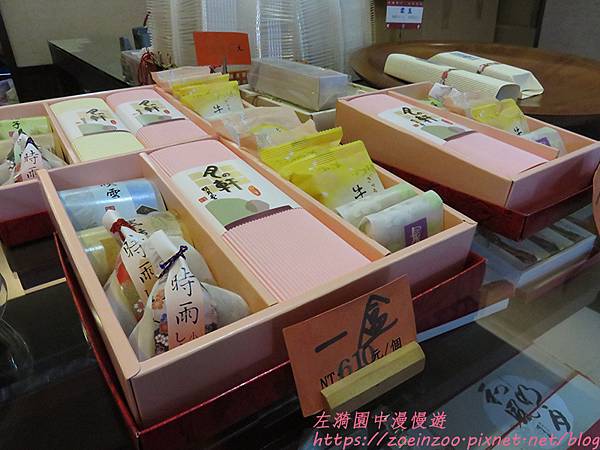 ↑店內的展示台也不大,產品都在這座櫃子裡或櫃子上了。看著陳列出來的和菓子每個都好誘人,就會每個都很想點看看,旁邊也都有價錢方便顧客挑選。