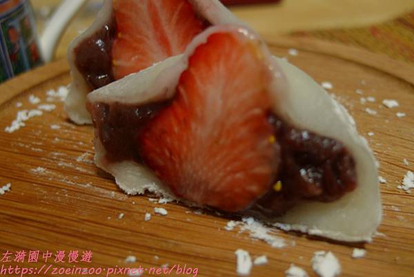 ↑切開大福,裡面是一整顆水嫩嫩的新鮮草莓,刀子劃下時還流出汁來。草莓是主角,配角紅豆餡並沒有太多,吃得到草莓多汁的酸甜口感,“新鮮”至極的草莓大福,也難怪店家建議當日享用完畢了。