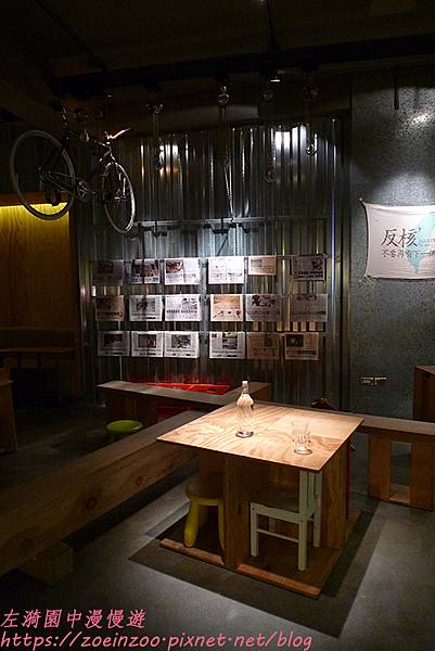 ↑一樓用餐區,其實晚上還蠻昏暗的,整間餐廳以水泥、原木、鋼鐵為主要素材,有結構主義或機能主義的設計風格。餐廳的一角,高掛著腳踏車,雖然個人有點不解這腳踏車裝飾在高處的意涵,但這線條俐落的腳踏車和這裝潢設計風格不會有衝突感。左漪超愛這面牆,這種掛報紙的方式,這idea真的太棒了,給三個讚。報紙就像是牆上的裝飾品一樣,整潔有序,想看甚麼報紙,報紙的頭條是甚麼都一目了然。