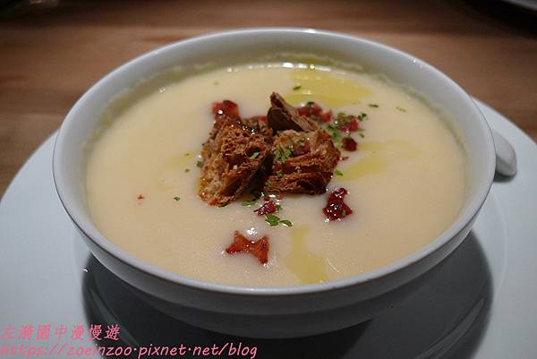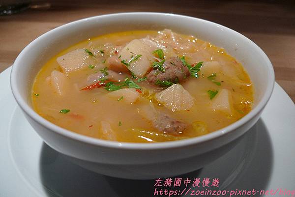 ↑今日湯的馬鈴薯湯,180元。這道湯不是很受左漪一行人的喜愛,除了前一碗義式香腸湯已經吃了很多馬鈴薯了,主要原因是這湯屬於濃湯類,整碗非常稠,比較像是在喝馬鈴薯糊,沒有喝湯水的感覺,不是大家的菜……