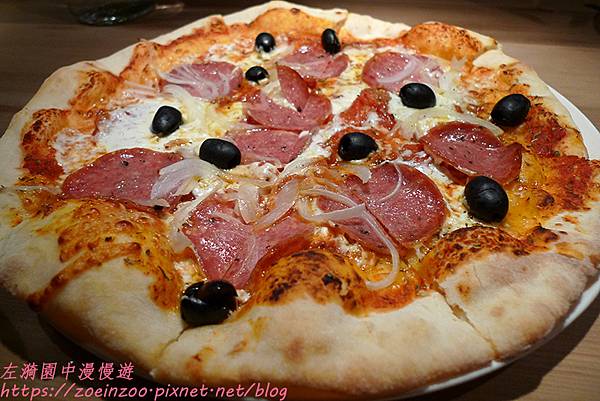 ↑薩拉米臘腸披薩,460元。這披薩不大,賣這個價格不算便宜說,配料不複雜,主角就是薩拉米臘腸,搭配幾顆黑橄欖和些許洋蔥。這披薩餅皮很薄,是我們大家都喜歡的薄披薩。整塊都非常入味,這也是馬上被大家一掃而空,吮指意猶未盡的一道料理。雖然價格貴,但還算值回票價。