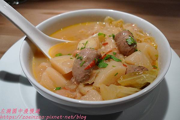 ↑海鮮湯,200元。點湯前有和服務人員確認這是一人份還是足量到可以分食,服務人員說是一人份的,果然來的這碗湯是一個人也能喝得完的。但我們都很想品嘗到多種料理,又都很想喝湯,就點了三種湯一起分享。這海鮮湯是菜單上唯一固定的湯品,被端上桌時,左漪和朋友們有點疑惑,因為這道湯外觀看起來有點像泰式酸辣湯,也有附一片檸檬讓顧客自行添加,感覺不太像會出現在這裡的料理說。喝起來口感還真的是泰式酸辣湯無誤啊XD,雖然少了些泰式特有的濃厚辛香調味,但更順口,裡面的配料有幾尾蝦和菇類。