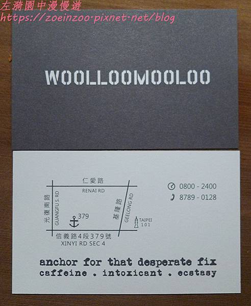 左漪要寫這篇文前,一直不確定要把「WOOLOOMOOLOO」歸類到何種餐廳,我們在這裡吃了義大利麵、披薩、燉飯、提拉米蘇,菜單雖是中、英文雙語,也好像出現了幾個義大利文用語,感覺應該就是要把它歸類到義大利餐廳啊!但是菜單上也有泰式、越南河粉,這不像是正統的義大利餐廳該供應的餐點說。而且聽說餐廳這串奇妙的英文名字來自於澳洲…(苦惱)。這裡從早上七點半就開始營業,提供了多種蛋糕和咖啡和茶品,的確非常適合吃早餐、早午餐,或者作為下午茶的聚會咖啡館。但這裡晚上營業到凌晨一點,白酒、紅酒的酒單一長串、威士忌也占了滿滿一頁,女生愛喝的雞尾酒在這裡也點得到,“天黑後” (菜單上真的是寫After Dark)才可點的晚上餐點以義式料理為主美味可口,左漪真心覺得這裡與其說是咖啡店,更算是一間適合晚上來用餐小酌的品味小酒吧!