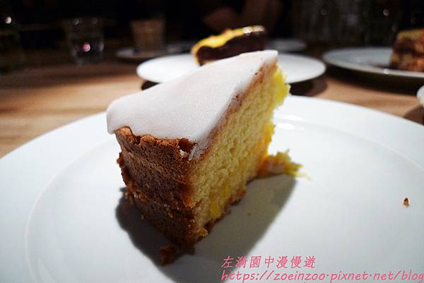 ↑檸檬蛋糕,120元。這是不愛吃甜的朋友點的,她以為會是個較清爽的蛋糕。混合檸檬餡料的海綿蛋糕部分確實酸酸的,但是上面那層白糖霜實在太甜了,不加糖霜吃又偏酸,加了又太甜,很兩難XD 。但左漪個人還算喜歡這種檸檬磅蛋糕口感的。