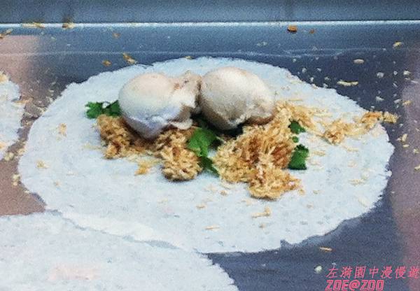 ↑正在製作中的花生捲冰淇淋,一捲35元。香菜是花生捲冰淇淋的最大亮點,〝花生粉+冰淇淋+香菜〞各自個性強烈的這三樣食物搭配混合已經奇妙,又捲在春捲皮裡,口感獨特、不黏手。每次吃時都想:發明這吃法的人真是天才!冰淇淋消費大國的歐美應該也沒想到的創意吧!
