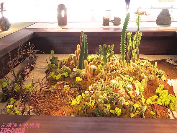 ↑另一區的空間佈置。因應這區比較沉穩色彩、有民族風格的展示品主題,使用的是塌塌米和山水意象,呈現一種日式風格。多肉植物和仙人掌都是真物喔!