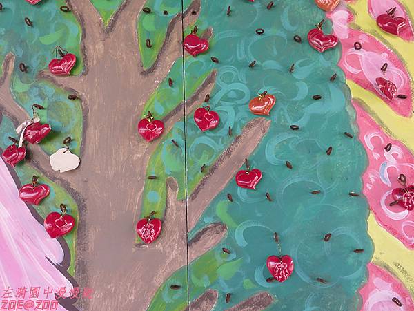 ↑遠遠看到牆上好像有一些突起物,看進一瞧才發現是樹上掛著一顆顆的陶瓷愛心,愛心的背面乘載著大家的海誓山盟和願望,原來是愛情樹或許願樹的概念。