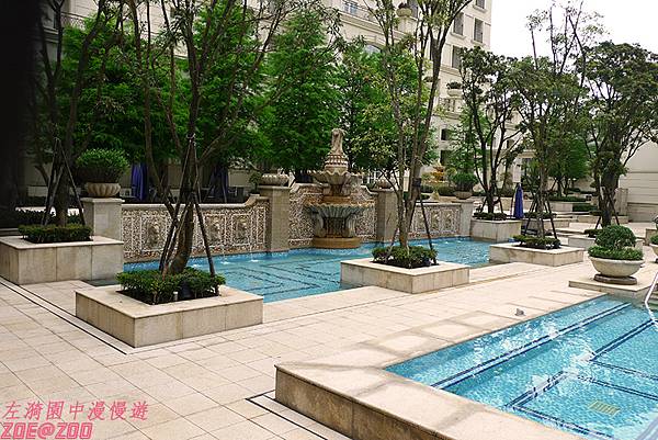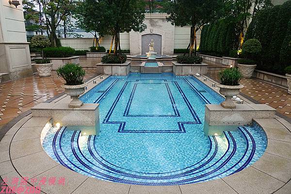 ↑中央庭園的水池大大小小,分成好幾區,高高低低的設計除了讓空間更有層次外,也增加了戲水的樂趣。因藍色磁磚的襯托下顯得水色湛藍。