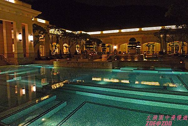 左漪個人認為位在蘇澳市中心的瓏山林周遭風景多是民宅,離好山好水有一段距離,除了地底的溫泉外,沒有受到很多大自然的恩惠。聰明的業者就以這白色浪漫的歐式莊園風格設計做為飯店的最大賣點,而這莊園的中心靈魂就是中央水池庭園,其他的建築物都是圍著這些規劃工整、大大小小的中央水池庭園而建的,但這水池不是普通的水而已,都是蘇澳的冷泉喔,仔細看池邊還有按鈕,應該是按了會冒出水泡或水柱出來的水療按摩設備,到了夏天應該很受歡迎。但是在微寒的春天尾聲,還是有點冷,對我們而言,只能算是個美麗的造景水池。這庭園也很受敝公司貴婦、千金們的喜愛,因為這地方太適合拍個人寫真特輯了,看大家搔首弄姿,不知抹殺了多少相機記憶體。個人很喜歡這庭園晚上的味道,為數頗多的精油蠟燭散發出來香味讓夜景更加浪漫,這蠟燭可是人工一根一根點上的呢!