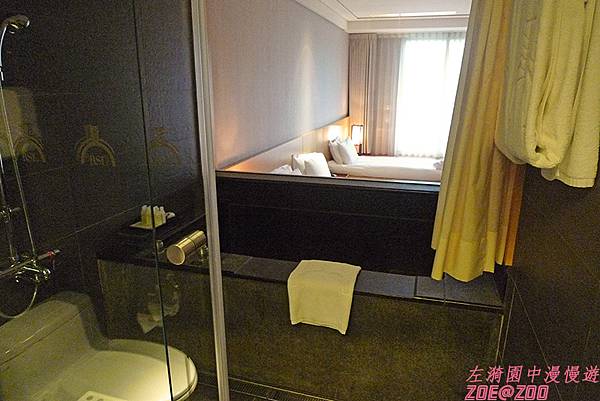↑浴室實際上採乾溼分離,照片上的馬桶是玻璃上的倒影。浴室和臥室的隔間是透明玻璃,當然有附窗簾可以遮蔽囉!不然實在很害羞耶!