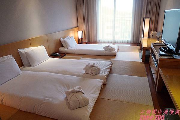 我們被分配到的是較低樓層的三人房,一進房就看到三張床墊已整齊的排列在和式塌塌米上。落地窗外就是比鄰的民宅,對於在房間內就立刻切換成放鬆模式,卸下所有裝備,衣不蔽體的我們只想盡快把窗簾牢牢關上。而也可能是房間和民宅距離很近的關係,一般溫泉飯店的主角--浴室都會設在風景最好的地方,這裡就只能設在房間門入口處了。據說較高樓層的房間浴室和臥室就是相反的,浴室靠外窗,臥室靠內,浴室也比較大,有分熱泉用和冷泉用的兩個池。而我們這間除了沒風景外,浴池也只有一個而已,不能體驗冷、熱交替使用的樂趣(總不會要我們泡完熱泉後趕緊把水放掉,再趕快換冷泉的水吧)。飯店內的備品就是普通中偶見高級品的驚喜。