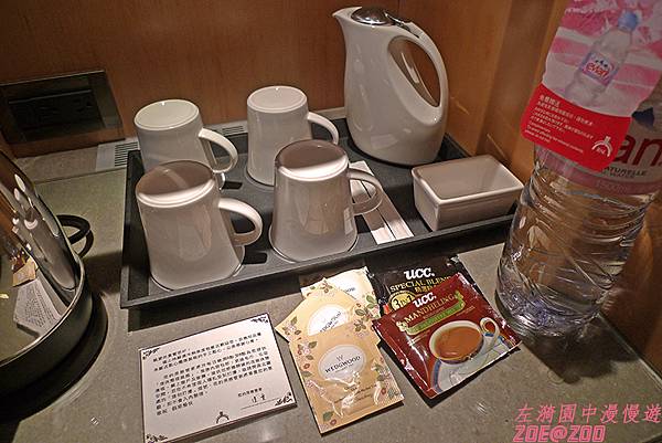 ↑茶具、茶、咖啡等備品。有贈送一大瓶法國Evian的礦泉水,還蠻令人驚喜的,但是只限一瓶,喝完不能再追加。茶包是英國wedgwood的喔!