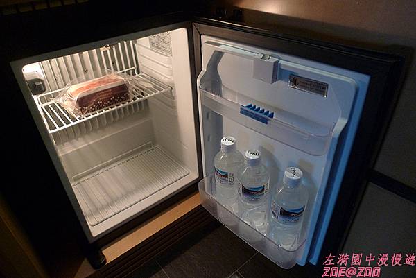 ↑冰箱內的免費飲料只有礦泉水。但是還有一個飯店的蛋糕。這蛋糕在紀念品店也是要數百元喔!