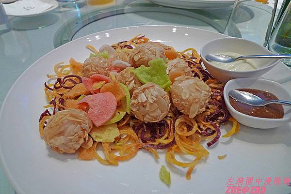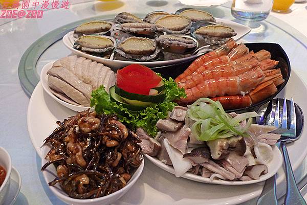 ↑通常員工旅遊的伙食都是走大堆頭路線,大多是量多而不精緻,讓大家呷粗飽就好。但是這次在瓏山林的晚餐真的讓左漪大開眼界、食慾大開。雖然一樣是合菜,但是有高級婚宴喜酒等級,果然是除了度假客外也有在努力經營婚宴市場的飯店啊,真的是星等級的餐飲!晚餐是在飯店的宴會廳,應該也是室內婚宴的場地,天花板上的布幕七彩變化,非常漂亮。接下來請看依序陸續登場的晚餐喔。