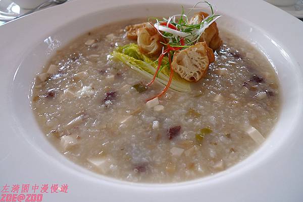 隔天的早餐用餐地點和晚餐不同,是在較為休閒的餐廳空間。一般高級度假飯店的早餐都是Buffet式,這裡卻是套餐式。套餐的主食也只有三種可選,粥、麵、漢堡,其他都是統一配套好的麵包、水果、鰻魚煎蛋。一開始我知道是套餐的時候,有點失望,因為擔心選擇少也怕自己吃不飽。還好這套餐的每一道菜其實是可以無限續加的,左漪的愛美貴婦、千金同事們就加點了好多盤水果(同事說:早餐就是要多吃水果,才有水水肌)。主食還可以混合加點,我這桌三人就共吃了兩碗麵、三盤粥、一盤漢堡,別桌的貴婦千金同事們紛紛發出讚嘆聲(同事搖頭說:別感覺良好啦!是感到不可思議的驚呼聲)。
