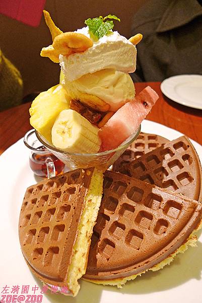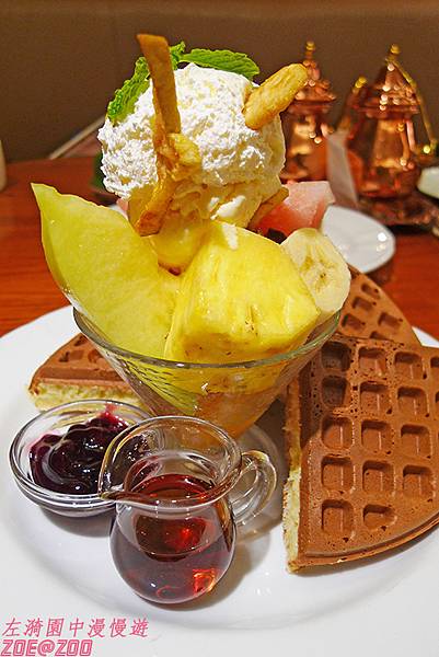 ↑季節水果鬆餅,160元。這個是左媽點的,杯子裡有多種類的水果,深得她的心,照慣例餐點一上桌她就迫不及待的要吃。除了新鮮水果外,冰淇淋上也插著幾枚水果乾。鬆餅的顏色和硬度實在太完美了,名副其實的“黃金鬆餅”!外皮烤的香香脆脆,裡頭軟綿綿的,兩者的厚度比例適中,不過度濕潤或蓬鬆,好好吃啊!!