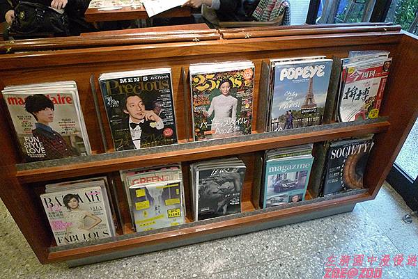 ↑門口的架上擺著各類型的雜誌,而且都還算新或是當期的,連哈日女孩們喜歡的日本流行雜誌也是新的,這點很令人讚賞。因為有很多餐廳、咖啡店雖然也有提供雜誌翻閱,但常常都是過期一陣子的了,我甚至還看過有前年的耶!