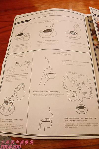 ↑菜單裡有一頁用簡單易懂的插圖教你如何品嘗咖啡或茶,而且還是中英對照。雖說內容都很基本,但很少在菜單上有利用大幅版面做這樣的說明,感覺到店家的用心。