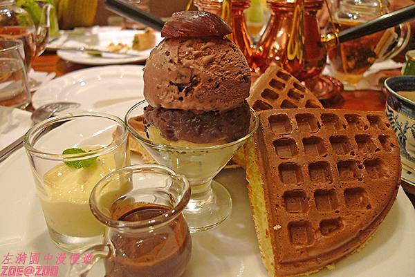 ↑香蕉紅豆巧克力鬆餅,170元。這是愛吃巧克力的左漪點的。一看就這覺得熱量好高,但我想反正現在是還是白天而已,接下來還有整天可以消耗熱量,就豁出去了XDDD。冰淇淋杯裡由下到上是撒上芝麻的香蕉、紅豆泥和巧克力冰淇淋,最上面點綴著半顆甜栗子,不知為何就讓人有秋冬的感覺。這道鬆餅除了主角的紅豆和冰淇淋外,搭配的是巧克力醬和香蕉口味的卡士達醬。
