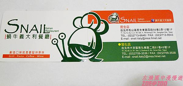 這次朋友多人聚會,其中的一個朋友愛麗絲推薦了她住家附近的「蝸牛義大利餐廳」。一聽到是義式餐廳,向來荷包看得很緊,聚餐預算規劃總想壓在五百元上下的其他幾位馬上哀嚎起來,嚷著不符合預算要換地方。愛麗絲馬上打包票說這裡絕對符合小資女聚餐需求,而且量超所值,足夠讓你飽到可能會要打包吃不完。果然,當天大家是一邊翻菜單一邊讚賞「真是來對了啊!」。