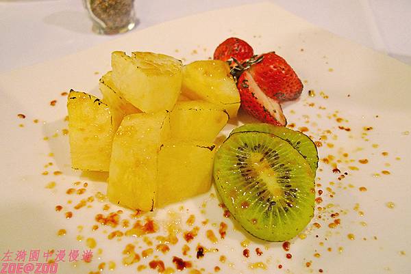 ↑水果。事後想想,套餐中好像沒有附甜點耶!完全不記得為何有這道了(囧)。反正有得吃就好,水果還有用火稍微噴烤過,整個變高級,升級成焦糖水果,連容易刮嘴的鳳梨都變得好好吃啊!