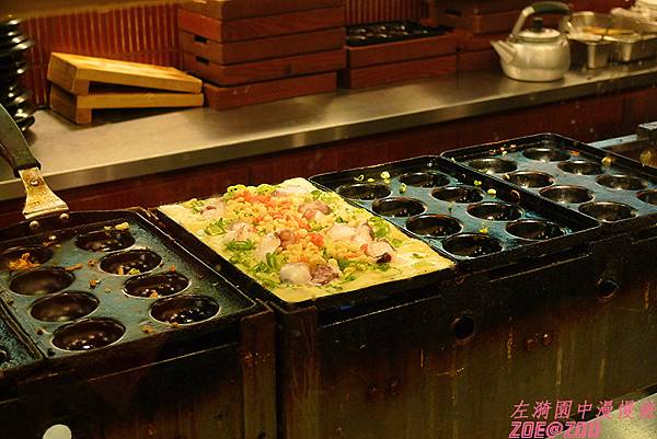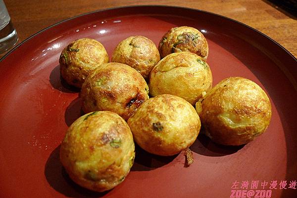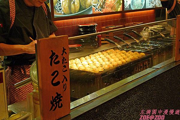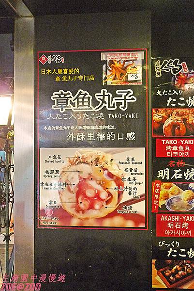 ↑店的入口處有一張寫著簡體中文的大海報,看來在對岸好像把章魚燒稱作“章魚丸子”了,但我還是喜歡叫它章魚燒,感覺就比較有日本味啊!不知道這是不是上海世博一舉成名後,店家才開始張貼這張海報的。不管如何,章魚燒的剖面圖加上詳細的介紹各種成分和構造,非常有趣又幫助我們這些外國人更加了解這道食物。只是什麼是「按照蔥」啊???