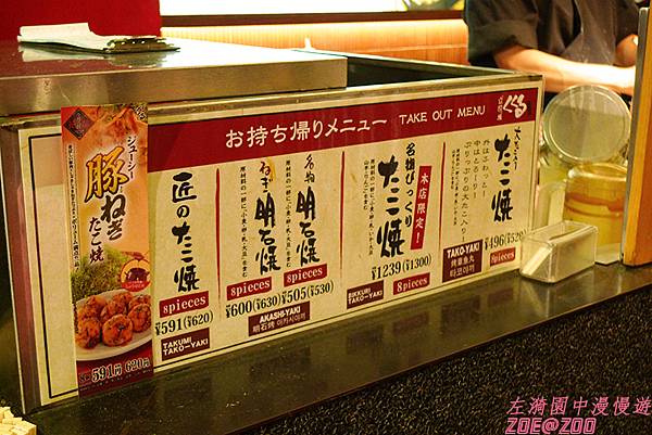 ↑這是可提供外帶的章魚燒菜單。內用和外帶的餐點價格完全一樣,但外帶的種類比較少,是比較基本款的。內用的菜單中不僅章魚燒的口味較多,也有很多其他料理可以選擇。