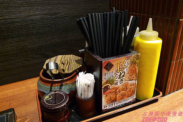 ↑桌上的調味料。等到章魚燒上桌後,才知道這些調味料還蠻重要的,餐前應該先好好認識的。
