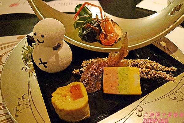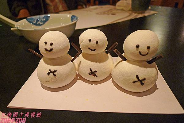 ↑每盤前八寸料理都有附這個應景的雪人,這雪人是糖霜和巧克力做成的,雖說不是很精緻,但也蠻可愛的,可以帶回家送給小朋友。請注意!服務人員有交代,這雖然是食物作成的,但是極甜,當作甜點的擺飾就好了。