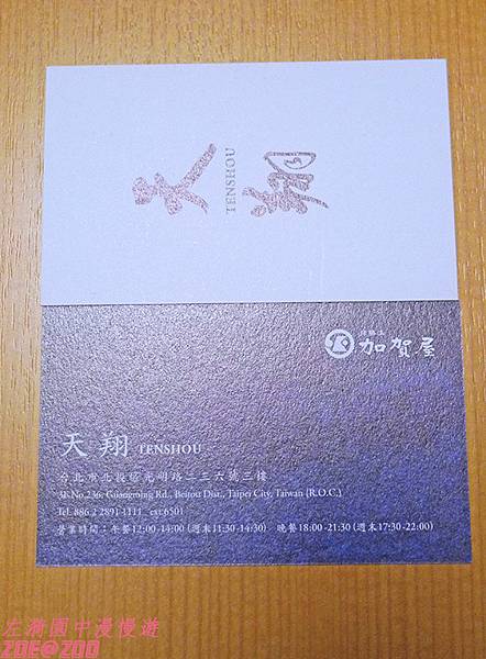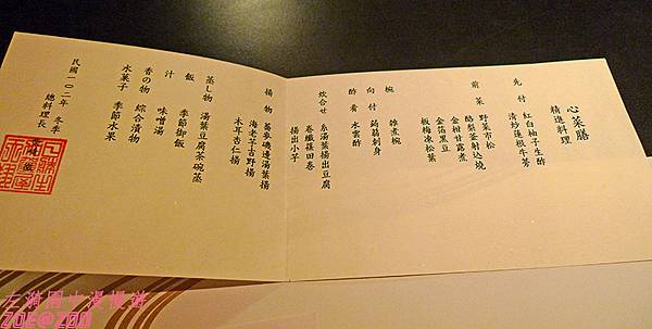↑左家一行入座後才發現每個座位上都有這樣一個菜單小卡,小卡封面右上方就是懷石料理套餐的名稱,這張是“能登膳”,表示我這個位置將會被安排上能登膳這套料理。先說明一下,天翔只提供三種套餐,兩種葷食、一種素食。葷食:能登膳,2500元、渚膳,3500元。素食:心菜膳,2500元。預約時就要決定好要點哪些套餐,不能當場才點。我們一行四人,點了兩套能登膳、一套渚膳、一套心菜膳。(本文中的餐點價格為2013年當時)