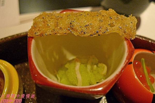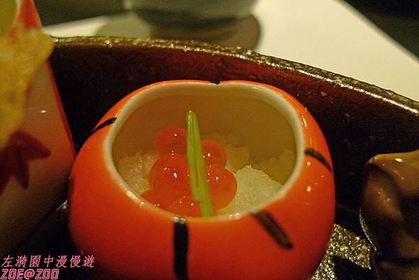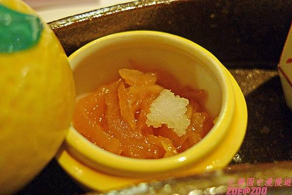 ↑從左到右依序介紹一下,這個是“雲子佐橙醋”,原來是佐“橙”醋,難怪這道料理要放在這黃橙小缽裡了!雲子就是鱈魚的精巢,就是缽裡那一小咪咪的白色就是。