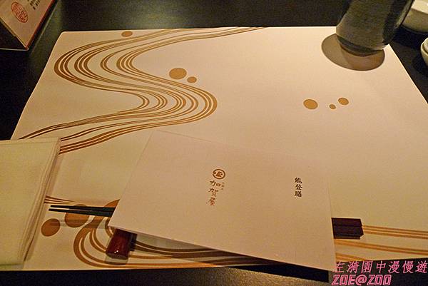 除了非素食主義者的左媽自己突然想嘗試素食版的懷石料理而自願吃心菜膳外,其他選擇葷食的我們在餐前並未決定好誰可以享受比較貴的渚膳,剛好眼前桌上這張菜單小卡就表示這個位置將被安排的套餐種類。未免爭相吃美食而破壞家庭感情,當場我們就將決定權交給上天,看誰坐到的位置上擺的是甚麼菜單誰就吃什麼,當天的幸運兒是左妹!(羨慕咬牙)