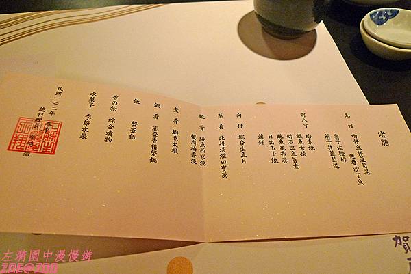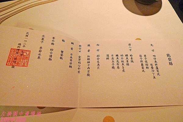 ↑這是放在我們位置上的菜單小卡裡的內容。懷石料理都會附有這樣的菜單,最後還會有日期以及料理長的用印或簽名。可以看到天翔的總料理長是日本人來著的。