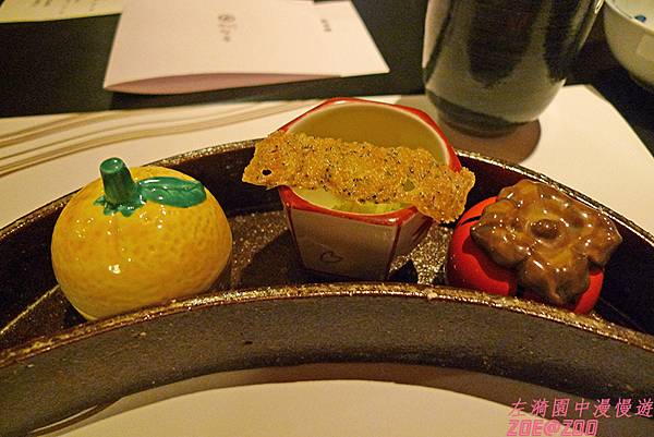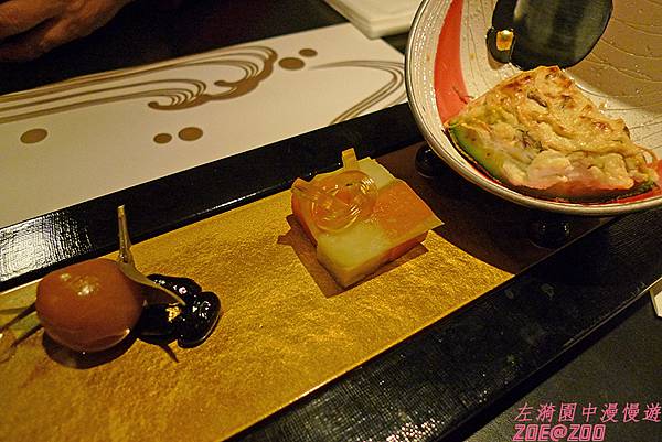 ↑2. 前菜。這盤裡有五種食材,野菜市松、酪梨釜射込燒、金柑甘露煮、金箔黑豆、板梅凍松葉。這道料理的擺盤很有意境,形狀奇怪的圓洞食器在家裡使用還真不知能擺甚麼。