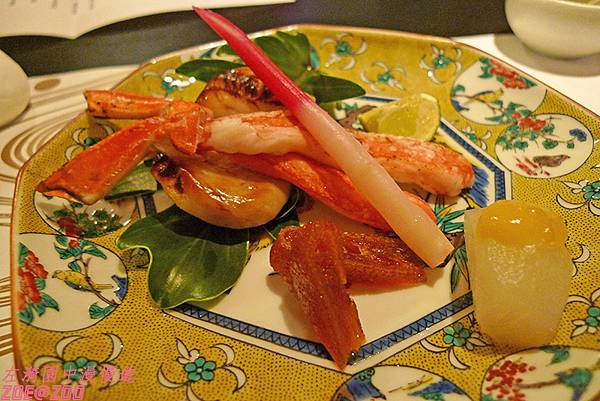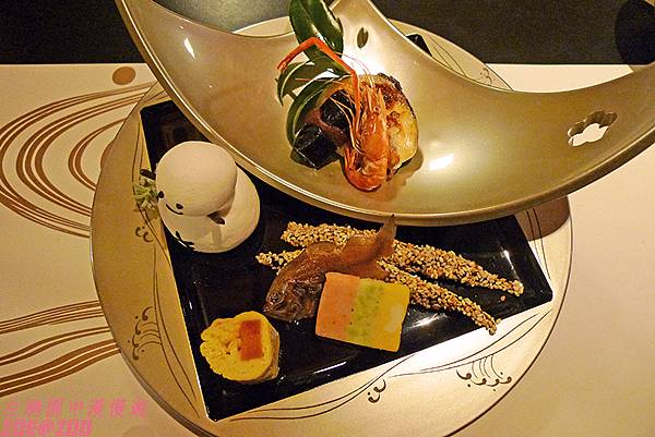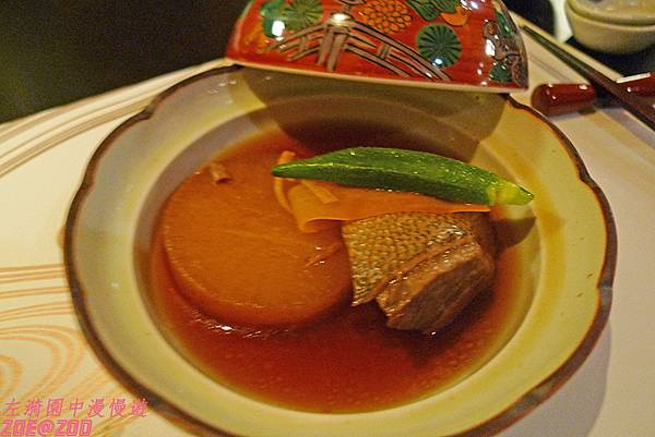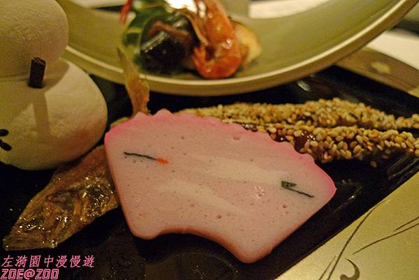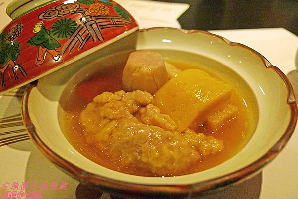 ↑雖說這道前八寸,能登膳和渚膳盤內的料理一樣,唯一有個小差異就是這塊蒲鉾(魚板),不知道是不是渚膳的料理比較貴的原因,所以搭配的魚板感覺比較富貴,魚板上有象徵長壽祝賀之意的白鶴。