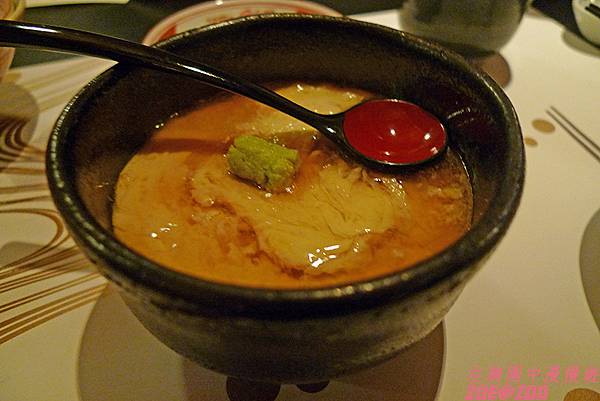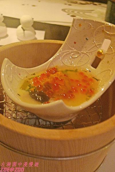 ↑北投湯煙田寶蒸。哇!食材很豪華,是海膽和鮭魚卵。很少吃蒸煮過的海膽,這個完全沒有腥味還保留滑嫩的口感,湯汁入味,超級好吃的!這道料理隨著蒸籠出來,裡面的陶器非常精緻,除了紋路之外,部分簍空還點綴了一顆金珠。