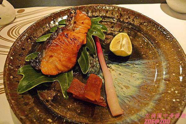 ↑紅鮭柚子西京燒。因為能登膳少了一道蒸肴,所以這道是這個套餐的第四道料理。鮭魚表面金黃,很香。左漪很愛配菜的這種細細長長頭戴紅的醃漬薑。