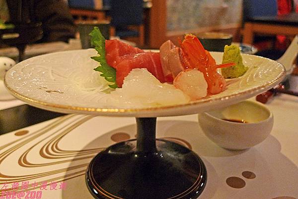 ↑綜合生魚片。渚膳果然是比較豐富,比能登膳的組合多了牡丹蝦一尾,鮭魚切片的部位也不太一樣。這個食器有些高度,很像是要獻呈給王公貴族享用的。