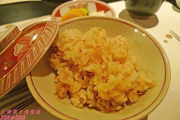 ↑蟹釜飯和綜合漬物。中國人是吃飯配菜,懷石料理是把飯作為最後的收尾。雖然吃到這裡我們已經飽了,但是這蟹釜飯吃得到蟹肉,調味適中,很下飯,讓人忍不住一口接一口。連釜飯的食器也附著精緻的蓋碗。