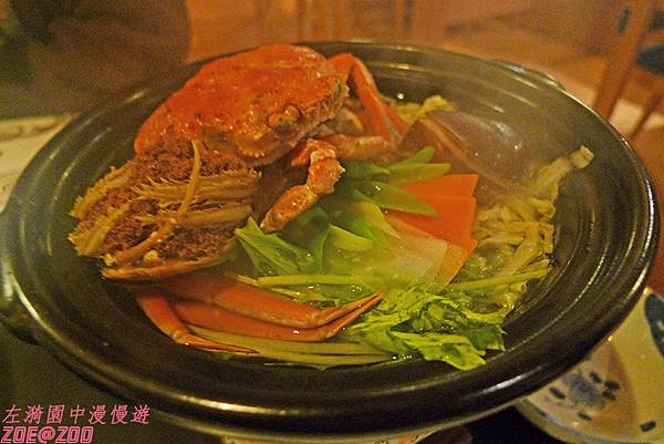 ↑能登香箱蟹鍋。這鍋一打開就看到一隻螃蟹。熱氣騰騰,整張照片都顯得熱煙瀰漫。這道料理雖然名為“能登”,卻是較貴的渚膳裡才有的料理。