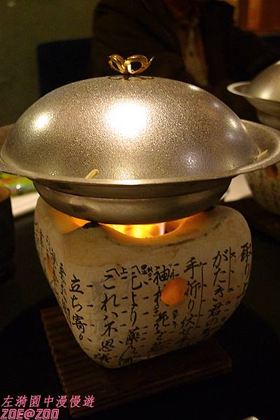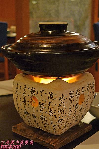 ↑日本寄世鍋。非常清澈的湯頭,口感也偏清淡。吃懷石料理的好處是可以吃到很多魚,即將進入這套餐的尾聲,再來片魚肉。火鍋用的小火缽也被美化了,寫著日文的書法,有種日式禪味。銀色金屬鍋蓋子上的小蝴蝶結很可愛。