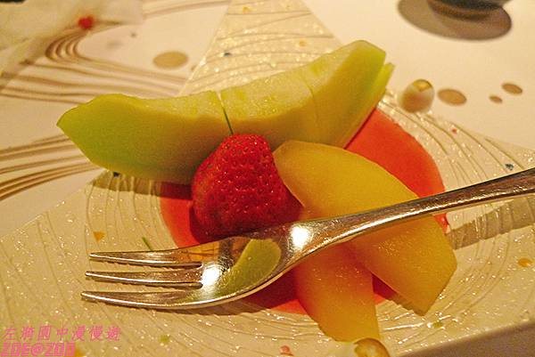 ↑季節水果。哈密瓜和草莓還OK,但是前面這個是醃漬水果,我因為不喜歡一口也沒吃,忘記這個是水蜜桃還是梨子什麼的了。