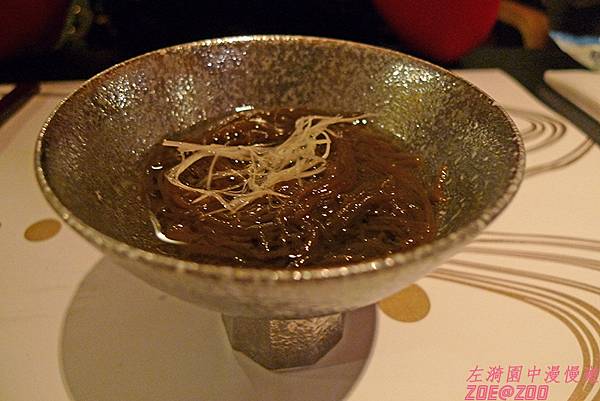 ↑4. 向付。蒟蒻刺身,也就是蒟蒻沙西米的意思。葷食的向付料理是真材實料的魚類沙西米,素食的則以蒟蒻替代,據左媽說這蒟蒻有彈性,非常美味。