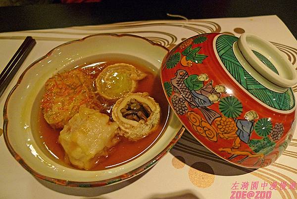 接下來要介紹的是左媽的素食套餐。因為她是個超級急性子,料理一端上桌就迫不急待的急著要吃,非常不耐煩左漪龜毛的拍照取景。不敢違背母令的小女我只能搶在左媽拿起筷子朝向食物之前的瞬間,快快的趕拍幾張。另外,她可能餓壞了,將懷石料理當「速食」吃,大家還沒回過神來,轉眼只剩下美美的空盤。因此…有關心菜膳,沒法就味道部分跟大家分享,說明不足、照片不齊全或不夠美,請見諒啦!