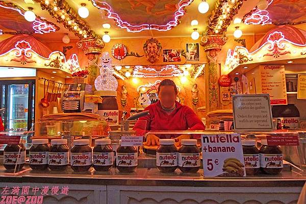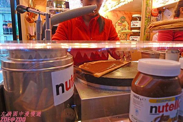 ↑在法國旅行時,看到路邊小店或餐廳到處都有賣nutella口味的甜點,住法國的朋友就跟我介紹說:法國人超愛nutella,這明明是個品牌,但已經像一個代表性的口味名稱了。巴黎香榭大道上的聖誕市集中,就有好幾家可麗餅店在店前擺了多瓶巨大的nutella作為號召看板。