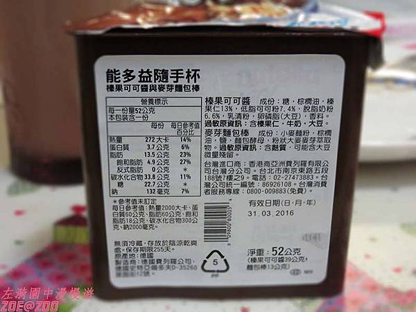 ↑隨手杯適合在辦公室、戶外即時享用。如果是在家裡,我覺得整罐的可可醬用途更廣。隨手杯的可可醬有39克,作為一餐甜點的分量很足,但吃完麵包棒即使沾醬有剩下,也不太可能保留下來繼續用。