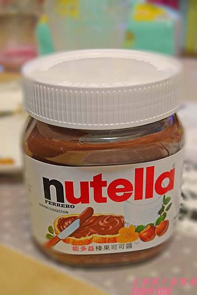 ↑榛果可可醬剛開封,可可的油脂會浮在上面,我習慣先攪拌一下。沒用完存放在冰箱裡的可可醬會硬化變成巧克力XDDD,所以使用時要放在室溫中幾分鐘,等它稍微融成醬後會更容易塗抹。